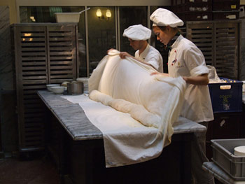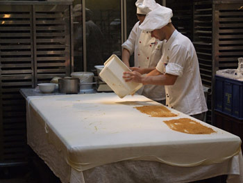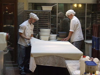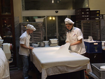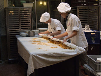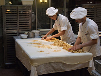 in the exact same round little pink and purple boxes. . "Do you know who invented the croissant?" Chef Dietmar asks me with a inquisitive smile. Before I have time to answer he continues: "Like most people you would probably say the French. The croissant, however was derived from the half - moon shaped Viennese Kipferl introduced by the Turks in the fifteenth century and the 'Apfelstrudel' was clearly inspired by the arab tradition of wrapping food in fila pastry". After showing me around the plush Fortnum's style showroom where shelves are stacked high with creations in sugar, marzipan meringue and chocolate and still made in Demel's original antique moulds. Dietmar invites me into the kitchen to see the famous 'Apfelstrudel' in preparation. The fila pastry is stretched by hand until gossamer- thin by two young chefs who working together brush it